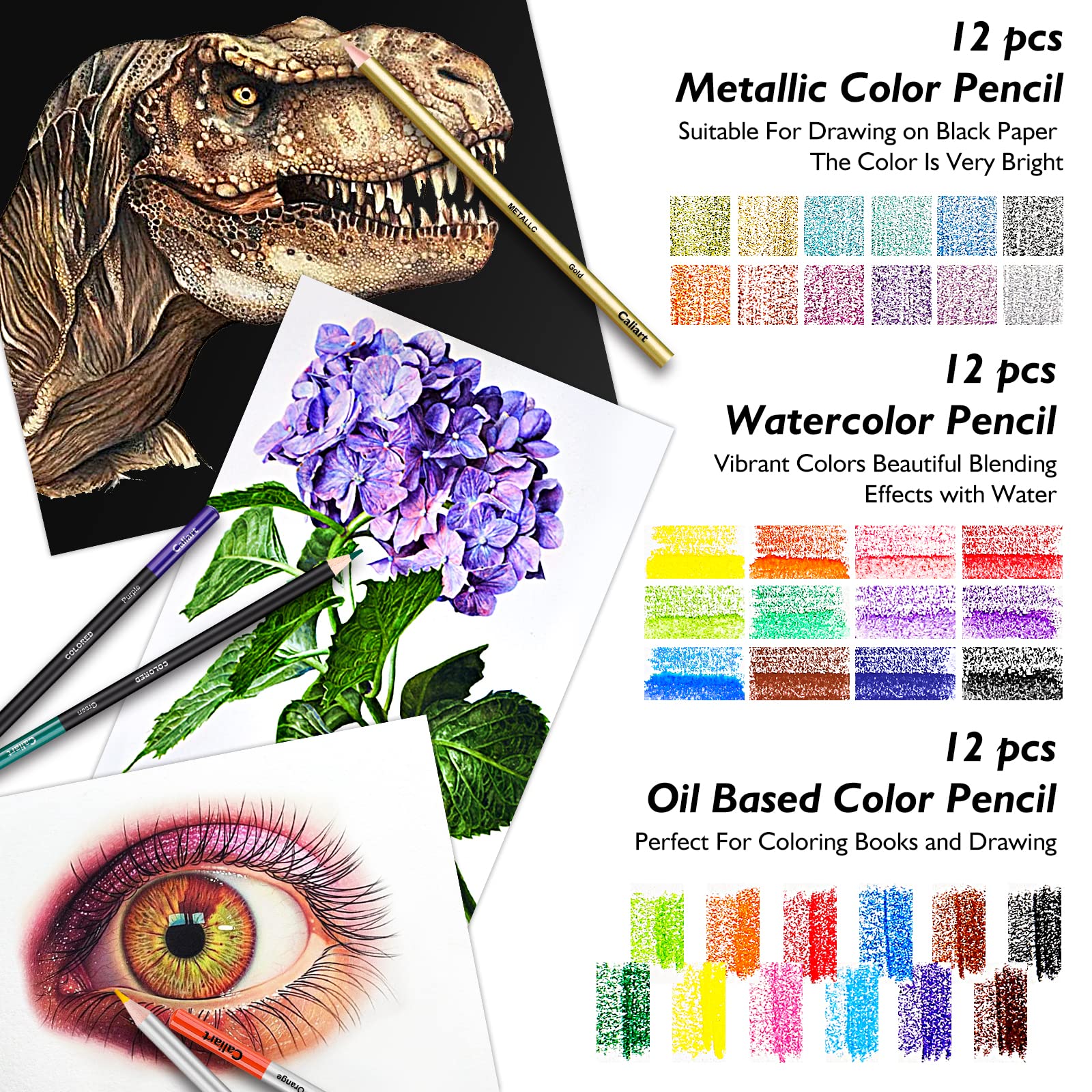 - 【All in one Art Kit】The Premium drawing pencils set includes 12 graphite pencils, 12 colored pencils,12 watercolor Pencils, 12 charcoal Pencils,3 white charcoal pencils, 12 metallic pencils, 3 blending paper stumps, refillable water brush pen, travel Case and more! Each pencil is marked with color name & number, and pre-sharpened. 76pcs art tools accessories plus a 100 sheets sketchpad, total 176 pcs! Perfect for drawing, sketching, shading, blending.