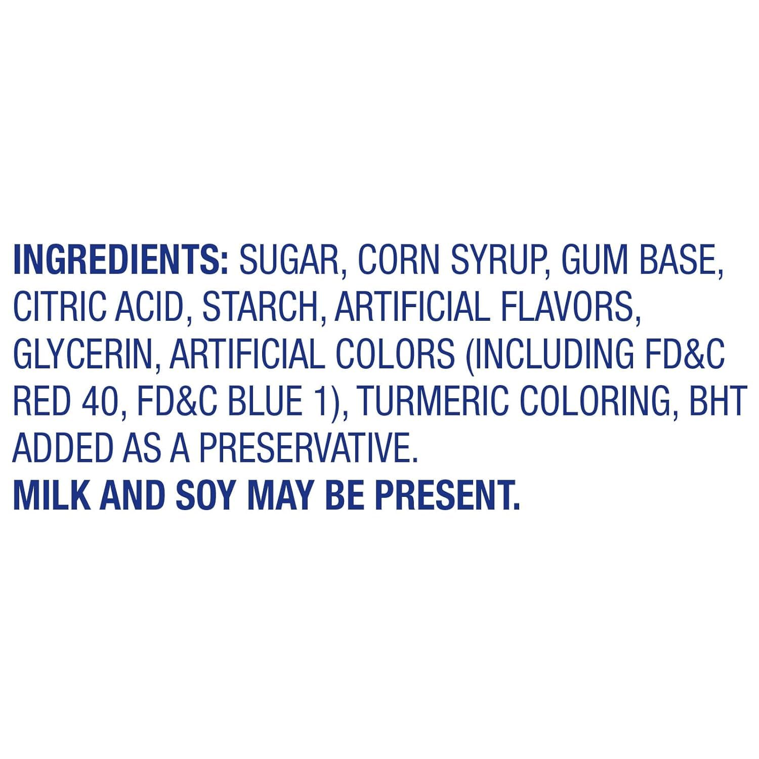 - Assorted flavors include Grape, Strawberry, Blue Razz Berry, Cherry, Watermelon, and Sour Apple flavors.
