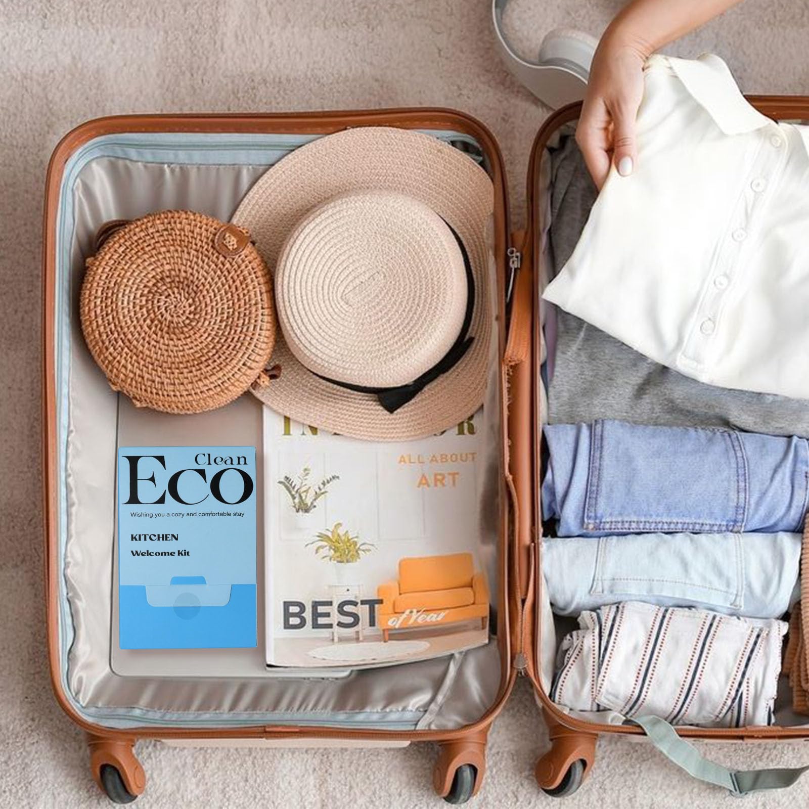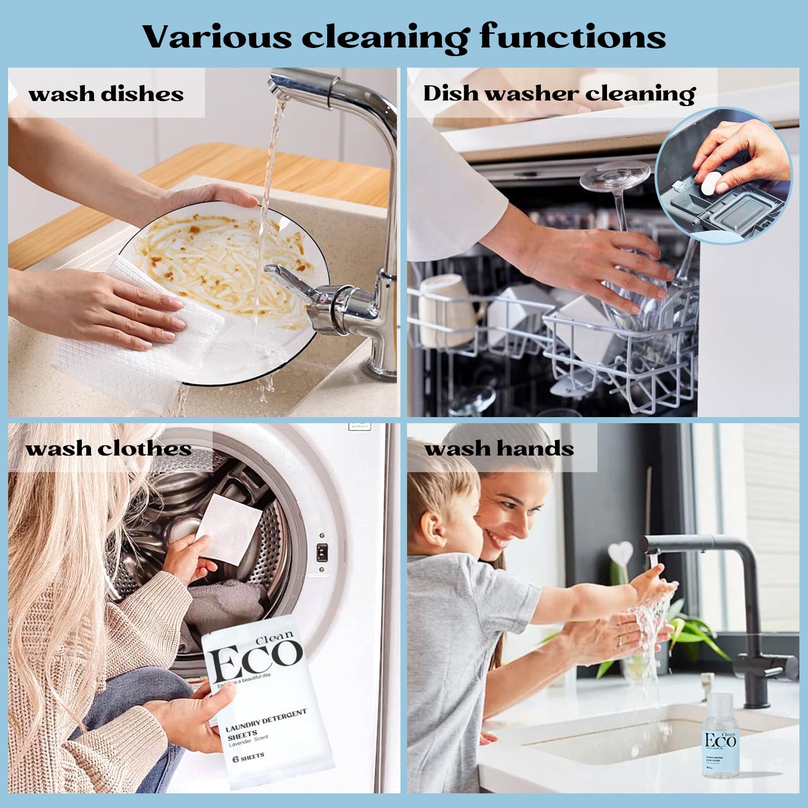 - Muti Purpose Kit: In the delicate box, there're 4 PCS Pre-load DISH CLOTH, 6 PCS LAUNDRY DETERGENT SHEETS, 2 PCS DISHWASHING TABLETS and A BOTTLE OF HANDWASH.