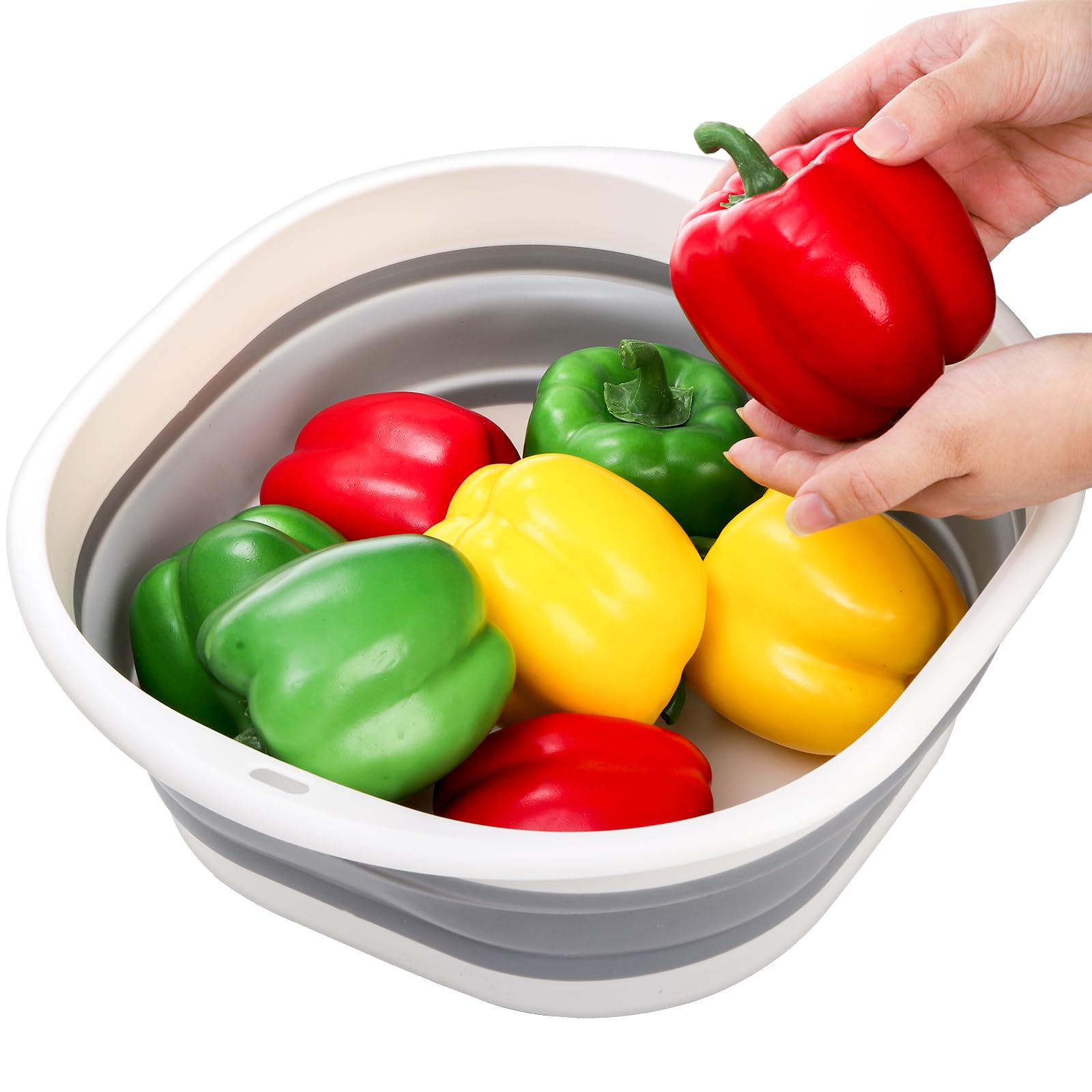 - Space Saving: Simply press the sides gently, each collapsible washbasin can be folded into a compact shape, which can be stored in your cabinet or cupboard. Besides, the hanging hole on the dish tub allows you to hang them on the wall when they are not in use.