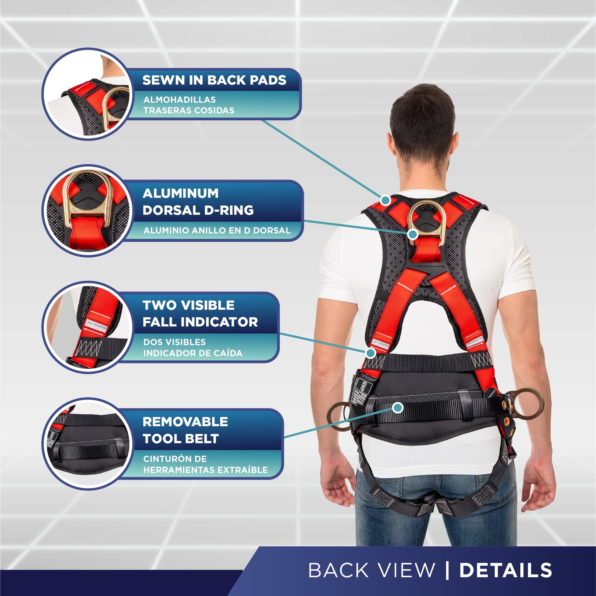 - š§° ADDED PROTECTION AND PEACE OF MIND: The sewn in back pad and fall indicators offer added protection and peace of mind for workers in high-risk environments, with a padded construction that helps protect the user's back and shoulders, and built-in indicators that make it easy to tell if the harness has been involved in a fall. Meets or exceeds ANSI Z359.11-2014 and A10.32-2012 standards, and is available in multiple sizes & colors to fit a range of workers and work environments.