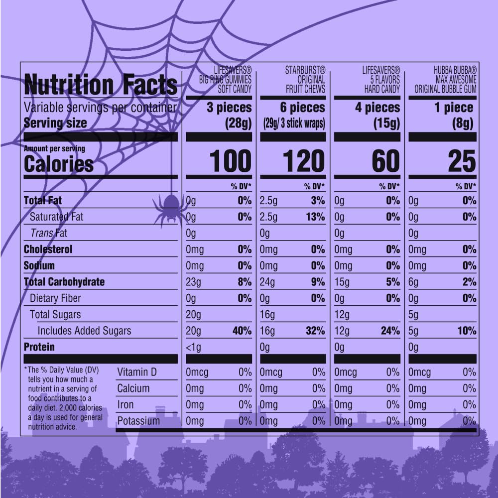 Details: Get ready to kick off Treat Season with our haunting assortment of STARBURST, LIFE SAVERS, HUBBA BUBBA Max, and LIFE SAVERS Gummies Halloween Candy Variety Bag. This 95-piece bulk variety is a nut-free option and offers the perfect blend of chewy, gummy, and hard candy, sure to delight all your neighborhood ghouls. Share and scare individually wrapped packs of STARBURST Original Chewy Candy, LIFE SAVERS 5 Flavors Hard Candy, HUBBA BUBBA Max Bubble Gum, and LIFE SAVERS Gummies—all made to be enjoyed by mouth. Whether you're filling boo bags, setting up Halloween decorations, hosting scary movie nights, or gearing up for trick-or-treating, this variety bag has you covered. If you're a Halloween enthusiast looking to elevate your seasonal stash, treat everyone to a taste of Halloween magic this Treat Season. Order your bulk candy bag of STARBURST, LIFE SAVERS, HUBBA BUBBA MAX, and LIFE SAVERS today!