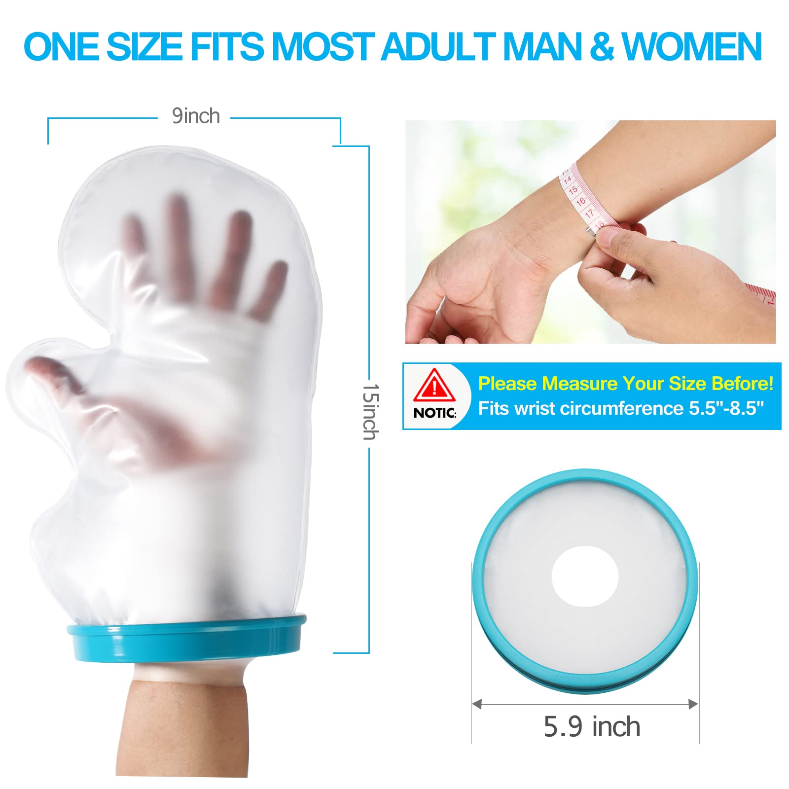 - ✔️【Patented design】Safe and convenient for shower or bath, Easily slide on the hand cast protector before bathing or showering to prevent water from damaging your cast and irritating your skin. Center hole fits hands diameter from 5.5'' to 8.5''. Adult hand cast cover is 14.5 inches long and fit for most men and women's hand. Item stretch size:14.5"(L)*9"(H)*5.9"(W).